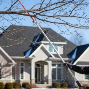 Heavy snow or ice accumulation can easily cause weak or dead tree branches to snap, resulting in severe and sudden roof damage. This risk increases during extreme cold. We advise property owners to trim back any branches overhanging the roof structure. This crucial step prevents physical damage and limits debris accumulation that can contribute to water retention and decay.